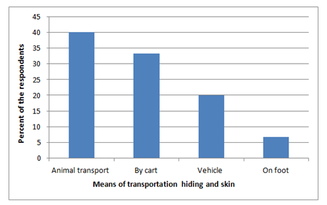 As indicated in Table 7, there are different methods of transporting hide and skin to the market in the study area. Accordingly, the higher proportion (40%) of the respondents used animal transport method to transport hide and skin to the village market, Woreda market, middlemen or to local processors. However, about 33.3, 20 and 6.7% of the respondents used a cart, vehicle and on foot respectively as transportation means of hiding and skin to market depending on the economic condition of the respondents (Figure 3).