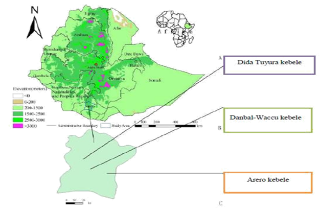 The study was made at Dida Tuyura, Danbal-Waccu and Arero kebele of Yabello district Borana zone, southern Ethiopia in 2018. It is situated at 566 km south of Addis Ababa along Addis–Moyale road. The area of Yabello town is 5426 km2, and located between 4˚30′55.81″and 5˚24′36.39″ north latitude and between 7˚44′14.70″and 38˚36′05.35″ east longitudes, the altitude is about 1000-1500m, maximum altitude of 2000m. The area has a bi-modal rainfall regime, with mean annual rainfall ranging from 400mm in the south to 600mm in the north. Which is the 73% of rainfall occur in March to May, the 27% of rainfall occur in September to November.11 The potential evapotranspiration is 700-3 000mm.12 The study area also dominated by savannah vegetation containing mixtures of perennial herbaceous vegetation. It is also confronted with the problem of bush expansion in the native savannah grass lands. Besides the area characterized by savanna grass land. There is no detailed information on the soils of Yabello rangelands. However, the main soils of the region comprise 53% red sandy loam soil, 30% black clay and volcanic light coloured silty clay and 17% silt and vertisols (Coppock 1994). Four major vegetation types have been described: