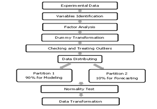 Figure 2 depicts the modelling flowchart showing all the procedures involved in this research, starting with experimental data comprised of site data collection and laboratory analysis, mathematical variables identification, factor analysis and dummy transformation, treating outliers, data partitioning for modelling (90%) and forecasting (10%). Preparing the data facilitates statistical analysis, and this includes checking for data normality, identifying necessary extracted variables, statistically adjusting for outliers and data transformation.11 Non-normal data were transformed into normality by using basic transformation such as logarithmic function and square root transformation.12