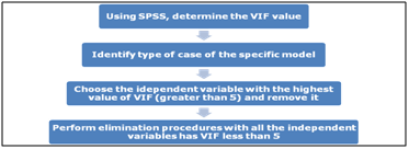 Phase 2 - selected models: After running the models using the SPSS, there were a few selected models obtained. The selected model was first determined using the Multicollinearity Test via the VIF values obtained. Multicollinearity test can be carried out in two ways which are by testing the correlation based value or through Variance Inflation Factor (VIF). In this study, VIF value used will be 5. The overall procedure to remove the variables via multicollinearity by using VIF is shown in Figure 4. This can be done in SPSS by going to Analyzeà Regression à Linear à Enter the required variables. The variable(s) with VIF>5.0, would be eliminated first. Subsequent elimination was carried out until the variables left were of VIF values less than 5.0.18 After the Multicollinearity Test, the next step was to conduct the Coefficient Test. Coefficient test was done by eliminating sequentially one at a time the variable(s) that had p-values more than 0.05.