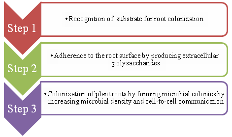 The root colonization by microorganisms involves series of steps: