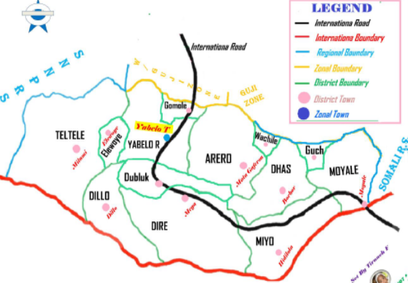 Borana zone is among the 20 zones found in Oromia regional state. The establishment of the zone was twice in the history. Firstly, the zone was separated from the former Borana zone (which includes the present Guji Zone and West Guji Zone) and re-established at the end of 2002 by including the present west Guji zone jointly known as Borana zone.1 Second time, at the end of 2016 the zone established again separated from the highland woreda’s of west Guji zone and left with almost all lowland pastoralist areas. Currently, the zone has thirteen rural pastoralist woreda namely, Arero, Dhas, Dillo, Dirre, Dubluk, Eelwoye, Gomole, Guchi, Miyo, Moyale, Taltale, Yaballo and Wachile and one town administration Yabello town which has the state function.2 There are 134 rural kebeles (PA) and 11 town kebeles in the zone; most of the districts haven’t basic services like telephone, water, banking and others. According to the 2019 Central Statistics Agency projection there are 503,877 people living in the zone whereas, male to female ratio is 1:1 and about 23 people are living in 1km2; entirely sparsely populated.3 This indicates that there is great difference in settlement between districts to districts. About 89% of the populations are living in the rural pastoralist areas of the zone. The zone is found in the southern part of the Oromia region. It shares borderline with west Guji zone to the north, Southern nation, nationalities and people to the west, Somali region to the southeast and to the south an international boundary with Kenya. The most ethnic group of the zone are inhabited by Oromo people of Borana, Guji and Gabra; the other Gari, Somali and various tribe of nation, nationalities and peoples are also living in the zone. Concerning the livelihood activities, the district and small-town dwellers are engaged in small trade while the others employed in different government and non-government organization offices.4 The life of rural community is mainly depending on pastoral and small rain fed agro-pastoral activity. Erratic rainfall is common in the area that accompanied with drought and desertification which results the death of numerous cattle in almost every year.5 The capital of the zone is Yabello town which is located 570km from the capital city of the country Addis Ababa. The town is on rapid growth and suitable for different investment activities.