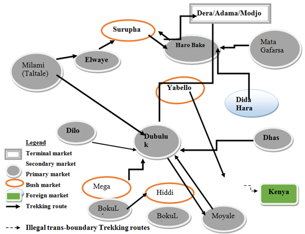 The livestock marketing system was founded upon a complex trading chain involving producers, intermediaries, traders and numerous other market participants. Animals move from bush, primary and secondary markets along key trading routes and corridors to terminal and export markets. This trading network spans ,beyond major secondary livestock market hubs such as Moyale Woreda (moyale), Dubuluq Woreda (dubuluq), Yabalo Woreda, (Haro-Bake), Taltale (Milemi), Arero Woreda (mataGefersa), Elowaye woreda (elowaye), DhasWoeda borbor), Dilo Woreda (dilo) the cross-border livestock trade is an integral part of life among communities living in remote pastoral areas. While proximity to the border can provide important benefits to adjacent communities, particularly in terms of drought coping mechanisms, communities can enjoy these benefits only during periods of peace. The major functional market place in Borana zone were listed blew in Table 13 (Figure 5) (Table 14).