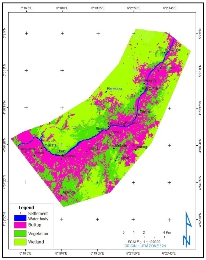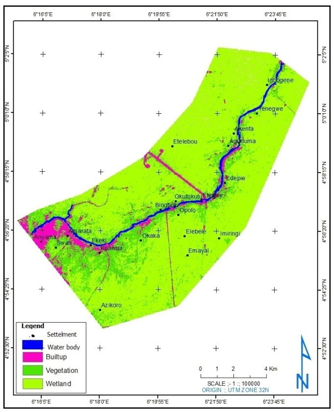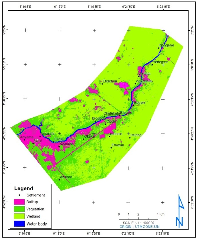 In 2010, wetlands at Igbogene reduced based on the total area of wetland in the study area. Igbogene have maximum area of 10.21Ha, while the minimum locations such as Swali and Anyama have almost vanished wetland of 1.10Ha and 0.36Ha respectively. In 2010, wetland locations at Anyama, swali, kpansia and Opolo was totally lost to other class of land use and land cover, Igbogene which happened to be the location with maximum area covered by wetland, reduced in size to 654.57Ha.