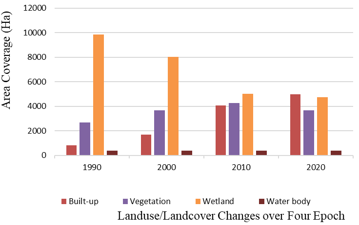 In 2020, the built-up area covers 36.29% (4987.37Ha) of the total land area. Degradation of wetland becomes very high. Wetlands covered 34.36% (4722.13Ha). The vegetation covered 26.69% (3667.77 Ha). The water body occupied 2.650% (364.11Ha); Figure 6 shows the statically model of land-use/land-cover as against Area Coverage.