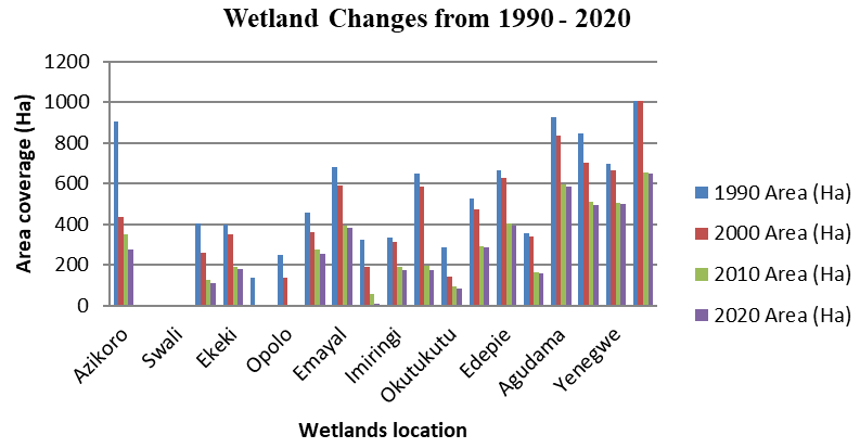 Table 5 analyses clearly on the Changes in wetlands over four Epochs, and the change between 1990 -2000, 2000-2010, and 2010 -2020 based on the analysis of wetlands location as shown in Table 6. Negative symbols in the statistics indicated a loss in the class. (Oludare, et al., 2015).