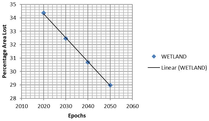 Since emphasis of the research work was on wetlands. The table 3.4 shows the predicted changes from year (epoch) of 2020- 2030, 2030- 2040 and 2040-2050 on the extent of wetlands over thirty years period in the study area. From 2020- 2030, it was expected that the loss of wetland in the study area will amount to -5.497% of total class area. From 2030- 2040, Wetland was expected to continually loss due to pressure from urban growth with -5.515% of lost from the total class area. From 2040–2050, the degradation was expected to continue at about-5.520% loss from the total class area.