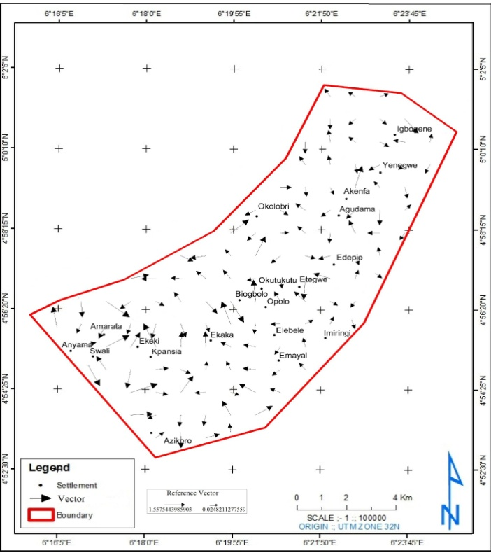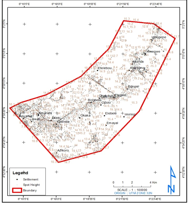 The surface flow direction of terrain of the study area in Figure 8 was produced using elevation data extracted from the satellite imageries of each epoch. Elevation has significant influence on wetland. Because water moves under the force of gravity and will generally moves from highland to low land. Thus, in any given environment, lowland areas are thus favorable for identifying wetlands. Elevation data was extracted from SRTM Digital Elevation Model obtained from website of Global land cover facility, university of Maryland. Elevation for the study area was used to produce a Spots height map, the Contour map, Victor map, Drainage Basin and the Slope map as shown in Figures 8–12, the spot heights ranges from 2.80m to 15.90m. It has a mean of 13.00m and a standard deviation of 2.68m. The vector map (Figure 10) shows the flow direction of the study area having reference vectors from 1.55 as maximum to 0.024 as minimum.8–11
