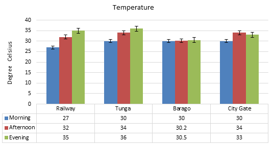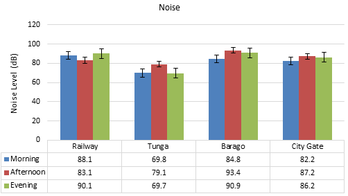 The Tunga Roundabout had the highest temperature of 36˚C in the evening, 34˚C in the afternoon and 30˚C in the morning (Figure 5). The second hottest roundabout was the Railway with 35˚C in the evening, 32˚C in the afternoon and 27˚C in the morning. The third hottest roundabout during the period under study was City Gate roundabout having 34˚C in the afternoon, 33˚C in the in the evening and 30˚C in the morning. The roundabout with the least temperature reading was Barago having 30.5˚C in the evening, 30.2˚C in the afternoon and 30˚C in the morning. The findings showed that the afternoon and evening periods of the day had the highest vehicular traffic flow, highest noise and temperature levels respectively across the selected roundabouts.