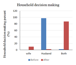 From the study, it is revealed that out of the 66 school going children in the community, all of them are going to school and each household have toilet in their houses which was nill before the support from the project. Previously, 97.5 percent of the household decision was made by husband and only 2.5 percent of the household decision was made together by both husband. Nowadays, there is a significant change in household decision making. Survey results show that percentage of household decision by both husband and wife has significantly increased to 87.5.and percentage of wife making household decision in the family is 10 percent, whereas the percentage of husband making household decision alone in the family has been decreased drastically to 2.5 percent (Figure 1).