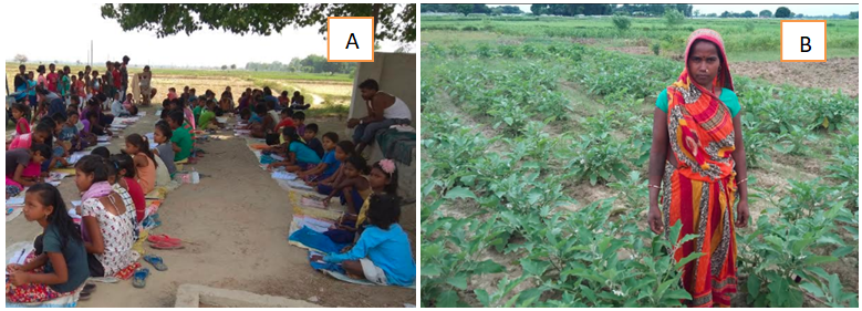 Figure 2 (A) Children from community in the regular tuition classes managed by RM (B) Gauri Sada in front of her eggplant field.