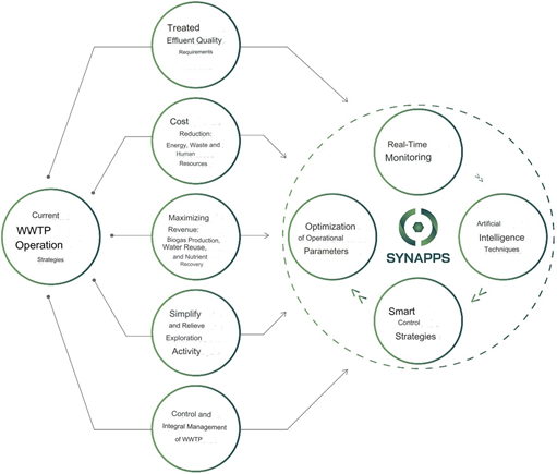Based on the implementation of multiparametric measurement chains and the application of computational intelligence techniques (eg Big Data Analytics, Data Mining and Machine Learning), the SYNAPPS platform should be capable of providing integrated management of the various WWTP treatment processes, ensuring a high environmental, energy and operational performance, and also simplify and relieve the burden of operating this type of technical infrastructure.