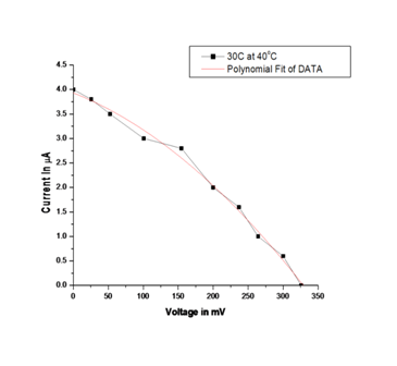Using triturated ZnO, we have been able to generate thermo‑voltage.10 Maximum voltage generated was found to increase with potency of the medicine (Figure 3). The efficiency of the cell with the medicine at potency 30C at 40°C was calculated from the current–voltage curve (Figure 4) and the value of efficiency is ~0.39%. .