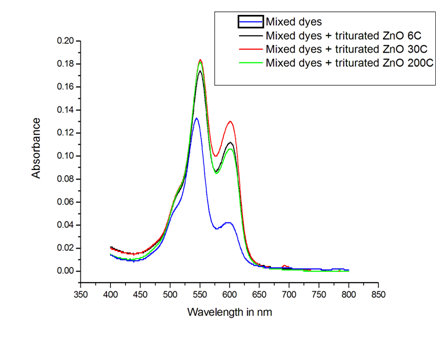 The energy conversion efficiency of the cell using three different potencies 6C, 30C and 200C of the medicine with same concentration of the two dyes (0.5x10–5 M) in all cases are 0.39%, 0.43% and 0.35% respectively. The efficiency is only 0.15% for the mixed dye under similar conditions (Table 1).11 In order to understand how triturated ZnO tuned the photoelectric properties of the dye molecules, the absorption spectra of the mixed dye in presence of triturated zinc oxide at different potencies had been studied (Figure 7). Azure C and Rose bengal have their characteristic bands at 545 nm and 610 nm respectively. With addition of the triturated ZnO, the characteristic peaks of the dye remain unchanged but absorbance increased. Our experimental results on photovoltage generation using triturated ZnO show presence of nanoparticles (Figure 1) of almost spherical shape and particle sizes within 5–7 nm.1,10 Due to adsorption of dye molecule on the surface of triturated ZnO nanoparticles, the absorption efficiency of the dye molecule increased.12 There is also a high possibility of forming exciplex between these two dyes at excited state which could not participate in the process of conversion of solar energy. Addition of triturated ZnO also plays a vital role here. As the dyes got adsorbed on the surface of these nanoparticles, they could participate now actively in the conversion process and the problem of spectral loss was reduced by better exploitation of the incident photon. The increase in efficiency of triturated ZnO at 30C from that of 6C can be explained from the fact that with increasing potency the particle size decreases, leading to increased surface to volume ratio.5 However at 200C, the concentration of nanoparticle is too low to participate in the conversion process resulting in lower efficiency than those at 6C and 30C. Our study of photovoltage generation in a dye–sensitized photo–electrochemical cell using Azure C, Rose Bengal and triturated ZnO at three different potencies shows that with addition of triturated zinc oxide in mixed solution of Azure C and Rose Bengal system, the magnitude of photovoltage, storage duration and energy conversion efficiency gets enhanced significantly and has maximum value at 30C potency. Spectral studies reveal that with addition of the nanoparticle, the characteristics of the dye solution remains unchanged while only overall optical density of the system increases indicating that there is no chemical reaction between the dyes and the triturated zinc oxide nanoparticle.