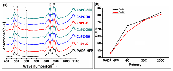 Fourier Transform Infrared Spectroscopy (FTIR) study of these nanocomposite films in the selected range of 400–1,100 cm−1 detected presence of α– and β–phases, Figure 8a. The FTIR spectra of CuPC and CoPC nanocomposite film show characteristic absorbance bands at 484, 606 and 878 cm–1 corresponding to the α–phase and around 510 and 840 cm–1 corresponding to the β–phase. The spectra indicate that there are no phase shifts or chemical interactions between the metal nanoparticles and the polymer film, but the intensity of α– and β–phases changes with the concentration of doping material. We observe in Figure 8b that with increase in potency, the β–phase peaks have grown significantly compared to those of PVDF–HFP. Using Beer–Lambert law, which relates absorbance with concentration of the absorbing species, the fraction of β–phase, Fβ, present in the (crystalline regions of) films was calculated using the formula,