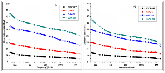 The variations of dielectric constant of all CuPC and CoPC film with frequency are shown in Figure 10a & 10b respectively. Throughout the whole frequency range, dielectric constant has substantially higher value in case of all CuPC and CoPC films compared to the pure polymer film. As there are two different conducting media present here (e.g. PVDF–HFP and TCu or TCo), this enhancement may be explained by MWS (Maxwell–Wagner–Sillars) interfacial polarization effect which appears in heterogeneous medium consisting of different phases with different permittivity and conductivity due to accumulation of the charges at the interfaces.24 The interfacial polarization is associated with the entrapment or accumulation of free charges generated in the cores at the interfaces between the cores and the matrix. At lower frequency the easy orientation of dipoles as well as MWS interfacial polarization contribute this (~) 4 times enhancement. As the frequency is increased further, dipole response is restricted and the dielectric constant has a saturation tendency. In this case, the internal individual dipoles contribute to the dielectric constant which is ideally the electronic polarization effect.