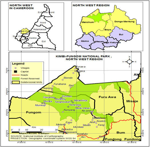 Kimbi-Fungom National Park (KFNP) is located between latitude 6.5-6.9˚ N and longitude 9.8-10.5˚ E in the Northwest Region of Cameroon and covers a total land surface area of 95,380 hectares (Figure 1). This national park is situated within three administrative divisions in the Northwest Region of Cameroon; Menchum, Boyo and Dongo Mantung.29 The region experiences two seasons, a long rainy season from mid March to mid November, and a short dry season from mid November to mid March. The wettest months are July, August and September and the driest months being January and February. The national park drainage system includes Kimbi, Katsina Al, and Kendassamen rivers. The soil types in this area include acrisols, andosols (Black soils of volcanic landscapes), and ferrasols.30 The vegetation is principally lowland tropical rainforest at the Fungom low altitude area of the national park, which is progressively transformed into a savanna landscape towards its northern region. The national park also harbors many wildlife species; primates, ungulates, carnivores, a host of rodents, reptiles and amphibians. Endangered species such as Chimpanzee (Pan troglodytes ellioti) and pangolin (Smutsia gigantea) are found in the park. Other primates include Mona monkeys (Cercopithecus mona), Putty-nosed monkeys (cercopithecus nictitans) and baboons (Papio anubis and P. cynocephalus).