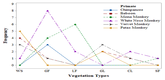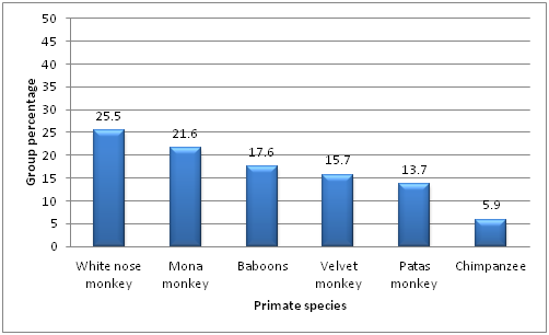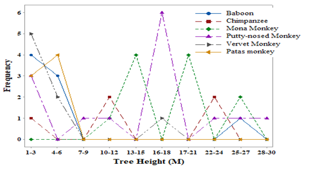 The observations made on the height of the primate species from the ground surface revealed 17.6% for baboons, 5.9% for chimpanzees, 21.6% for mona monkeys, 25.5% for white-nosed monkey, 15.7% for vervet monkeys, and 13.7% for patas respectively. This is a clear indication that these primate species are arboreal (Table 2). The chimpanzees were observed with the least arboreal life due to the body size, as compared to the quenon monkeys (mona and white-nosed monkeys) lighter in body weight. In primates the body weight is a determinant to their arboreal life.