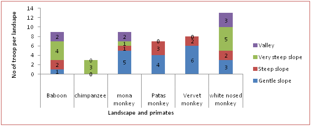 The landscape was another environmental that was witnessed determining the primate troop encounters (Table 3). A total of 19 troops of primates were encountered on the gentle slope areas of the national park. This might be because of availability of food resources, easily accessible as compared to other landscape areas which were observed with primate food in some locations but with difficult access. The valleys were observed with the least number of primate troops 7, low food availability of this area might be considered as a key contributor to the low primate troop frequency in the area.