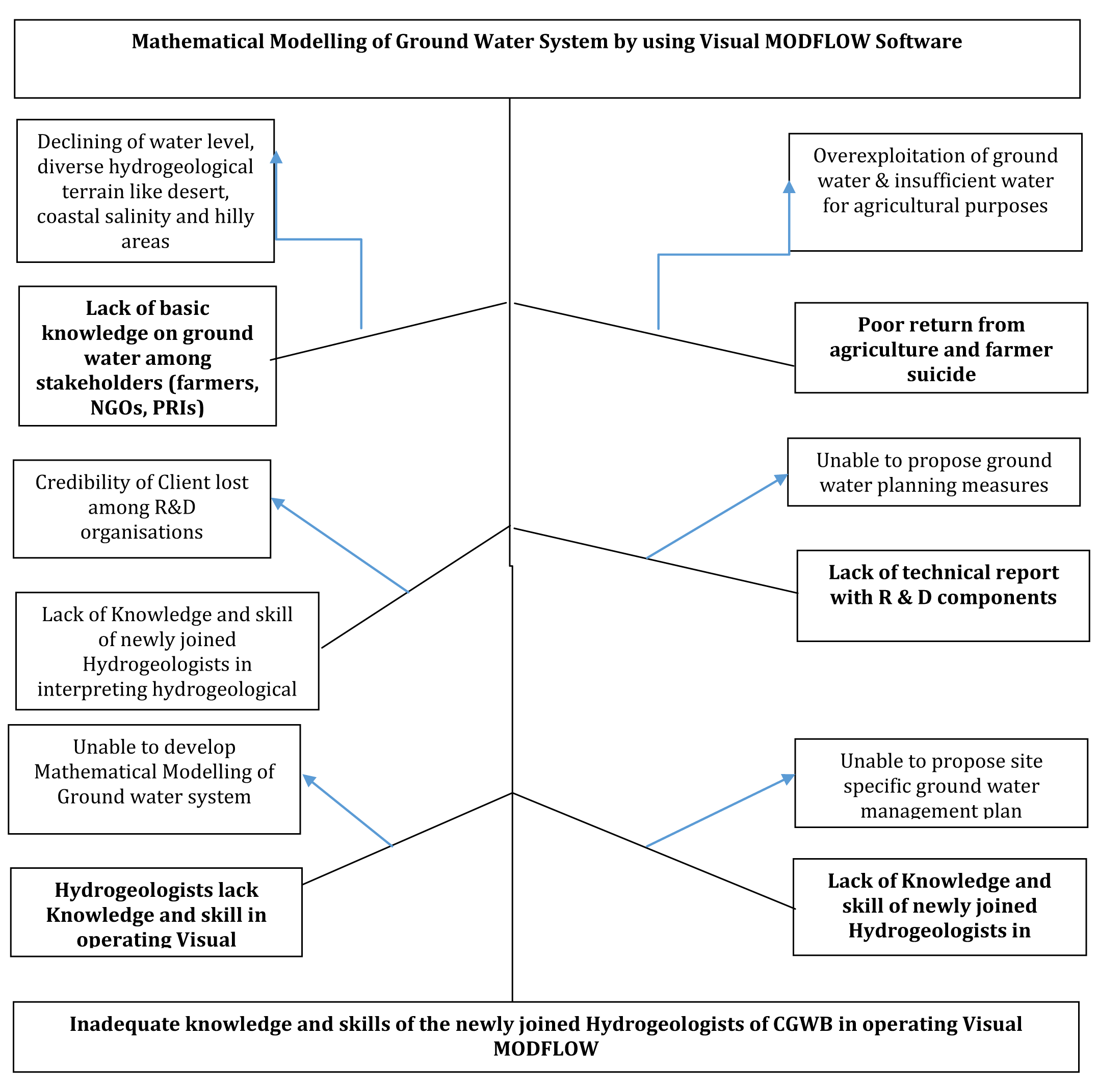 Symptoms of the problem: The trainee officials lack Knowledge and skill in operating software, lack of knowledge and skill to analyse and interpret hydrogeological data using Visual MODFLOW software and the client cannot publish technical reports with R&D components in time and the CGWB lost its credibility. |