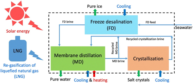 Zero liquid discharge desalination (ZLDD) is a sustainable solution to the global water scarcity problem. It provides high water recovery, zero waste generation and valuable salt production. Lu et al.,12 have developed a mathematical model of a novel ZLDD system that consists of freeze desalination (FD) and membrane distillation-crystallization (MD-C) also developed based on the theories of heat and mass transfer as well as experimental results. To improve the energy efficiency of the system, effects of important parameters, such as the feed temperature, concentration, and distillate temperature of MD and the recovery ratio of FD on system operating curves and energy consumptions have been systematically investigated with the aid of mathematical modelling. For a lab-scale hybrid ZLDD system operating at optimized conditions with a daily seawater processing capacity of 72kg, 50% of its heating energy can be supported by a 50.5m2 solar panel and its cooling energy can be 100% provided by re-gasification of 207-kg liquefied natural gas.12 Figure 1 has presented how the desalination works and sea water converted into pure potable water.