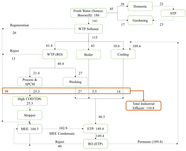 Water balance diagram and flow diagram of ETP of a typical pharmaceutical industry is depicted in Figure 3 and Figure 4 respectively. Effluent generation from industrial activities is 110.8 KLD. Total effluent generation from the industry is segregated into high COD/TDS and low COD/TDS concentration streams. High concentrated wastewater stream from manufacturing process is treated in stripper followed by Multiple Effect Evaporator. Treated water from stripper along with WTP reject is sent to MEE. Condensate water from MEE is sent to ETP along with other low COD/TDS waste streams i.e. cooling, washing and boiler. After treatment in ETP followed by RO, permeate from RO is reused for cooling and reject is sent to MEE. Hence, there is no discharge of treated effluent from the industry and unit maintains Zero Liquid Discharge.