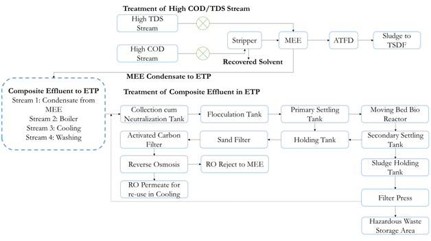 API, primary treatment, secondary treatment and tertiary treatment. The tertiary treatment is mainly Reverse Osmosis and permeate is utilized and rejects are discharged into cooling tower |