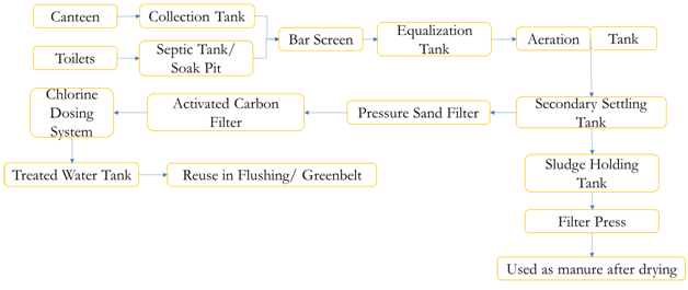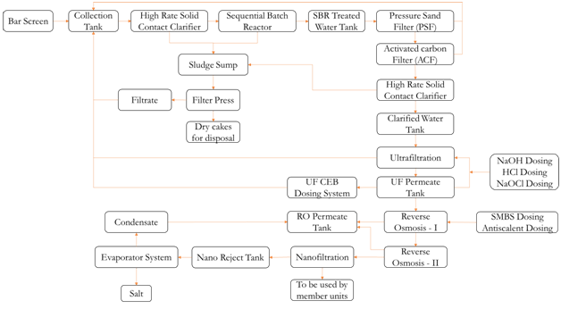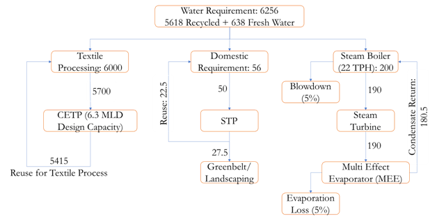 The quantity of wastewater generation from a typical textile processing cluster depends upon the quantity of water used for various purposes. Water balance, flow diagram of CETP and flow diagram of common sewage treatment plant of a typical textile processing cluster are depicted in Figures 5–7 respectively. The effluent generated is treated in the CETP and reused for textile process. Wastewater generated from the domestic activities is treated in common sewage treatment plant and treated water is utilized for toilet flushing and greenbelt maintenance. Therefore, no wastewater is discharged outside the cluster premises and the proposed project is operated on zero discharge condition. The blow down water from the boiler is treated in the RO system followed by deaerator. The condensate return after the evaporation and steam loss is recycled for boiler make-up, until there is any source of contamination or dissolved solids contained within the system. Hence, industry can achieve the ZERO liquid discharge system. The most important factor is to check the output parameters before using this water into any process. As per the ZLD systems installed in various industries in Gujarat, they are using the waste water after treatment into the process and other miscellaneous uses like drum and reactor washing, floor washing, dust suppression, green belt watering, etc.13