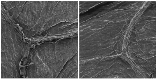 It was verified low number of stomata on the sixth day of storage as shown in Figure 2. As in the first day, the stomata were open, showing high transpiration (gain or loss of water) which is stomata function in plants, proportional to breath rate.16 On the sixth day, leaf’s surface had shriveled appearance, according17 this could be caused mainly by physicochemical changes such as the loss of water for the environment. As shown in Figure 3, lettuce leaves were very rough; this may be due to breath activity along the shelf life on the fourteenth day of storage.