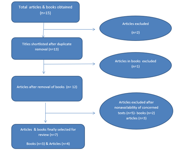 In the first phase of the study, books and articles were identified on the basis of the study objectives. In second phase all the data is pooled together after identification of objective based texts. Then exclusion of non-concerned data by reading titles and materials was done. By the end of this process, the concerned texts meeting the inclusion criteria were included in the study.