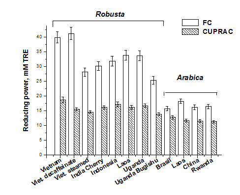 The ability of the studied robusta green coffee to reduce FC reagent was significantly higher than arabica type (Figure 1). This different behavior is due to the phenolic components present in these extracts (Table 2). The highest value was obtained for Vietnam coffee, both caffeinate and decaffeinate (39.90 and 41.3 mM TRE), respectively). The same type of coffee, but steamed at elevated temperature and pressure, exhibited much lower reducing power (28.2 mM TRE). Steaming process is used to remove irritant components and improve coffee aromas creating much more delicate and neutral robusta. Among arabica types, coffee from Laos presented the highest reducing power in FC assay (33.9 mM TRE). Similar order of green coffee reducing power was observed employing CUPRAC method (Figure 1). The highest value was observed for Vietnam coffee (18.7 mM TRE) and the lowest for all arabica types (11.3-12.8 mM TRE).
