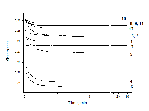 The kinetic curves of scavenged DPPH radical by studied green coffee infusions are shown on Figure 2. A fast and remarkable decrease in the absorbance of DPPH• was observed during the first few minutes of the reaction, particularly for robusta coffees, followed by slow subsequent disappearance of the reagent. This fast step essentially refers to the electron-transfer process from -OH group in phenolic molecule to DPPH radical and latter kinetic reflects the remaining activity of the oxidation-degradation products.21 For arabica types only a slow decay of DPPH• absorbance was observed.