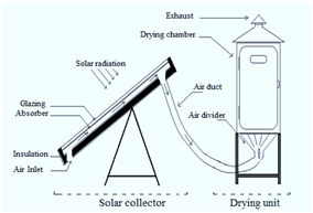 The indirect solar dryer with forced convection (Figure 1) is used in this study. It designed and realized by the LESEI laboratory.14 Figure 2 shows a photograph of this solar dryer. It consists of mainly a solar air heater, a centrifugal blower and drying chamber.