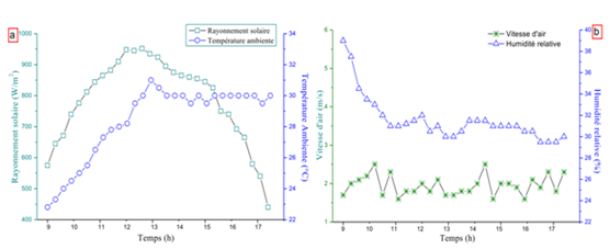 There is a significant difference between the value of the ambient temperature and the temperature at the output of the solar collector (Figure 6), this temperature difference varies from 10 to 33.9°C during the day of the experiment. Knowing that the ambient temperature is between 24 and 32°C for the day considered. The difference is due to the influence of solar radiation on the absorber and to the greenhouse effect, which has results among the absorber and the glass cover, playing an important role in the heating of the air flowing through the air inside the solar collector.