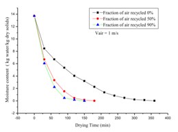 It is obviously observed from the Figure 4, that the moisture content is decreased faster at the initial stages of drying and thereafter became slower as drying proceeds. It is seen from the Figure 5 that the drying rate increased marginally with the increase in fraction of air recycled.17,18