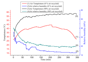 The drying temperature is higher and stable in the drying chamber of the order of 55 to 65°C, under the effect of recycle exhaust air (90% air recycled). However, in the drying recirculation of exhaust air, it is more disturbed and variable of the order 26 to 43°C (0% air recycled) are shown in Figure 7. This is the simultaneous action of reheating the exhaust air recycled, causing the temperature stability in the drying chamber, and then a significant decrease in drying time. An essential factor in the drying process is the air relative humidity; the variation of the exhaust air relative humidity with drying time at different fractions of air recycled (up to 90%), is shown in Figure 7. It is seen from the figure that the relative humidity of the exhaust air is higher in the beginning of drying and decreased with drying time as drying proceeds and became constant in the final stage of drying. This is because the higher drying rate of the spinach leaves during initial stage of drying results in release of more moisture in the drying air. It is also observed from the figure that the relative humidity of the exhaust air increased, with the increase in fraction of air recycled.