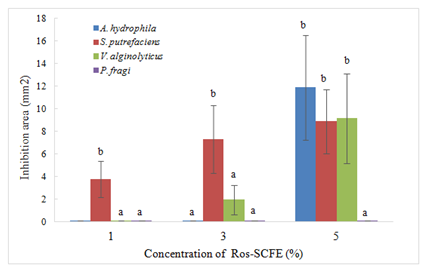 Figure 1 Inhibitory areas (mm2, excluding film area) of WPI films enriched with rosemary SCFE against A.hydrophila, S. putrefaciens, V. alginolyticus, and P. fragi. Different letters mean significant differences among concentration of SCFE (p < 0.05).