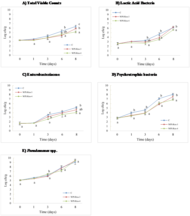 Figure 2 Evolution of the natural microbiota of WPI-ROS coated tuna steaks. C: Control; WPI-Ros-3: WPI + Rosemary SCFE 3%; WPI-Ros-4: WPI + Rosemary SCFE 4%. Different letters mean differences among treatments in the same day and bacterial group (p < 0.05).