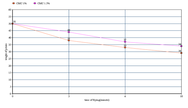 Garcia C et al.3investigated the effects of several hydrocolloid materials, including, gellan gum, CMC, pectin. Several groups were different effect on reduce oil migration. Hydrocollids with thermal gelling or thickness properties have been tested. Researchers resulted cellulose derivatives for coating formulations to reduce the oil uptake of fried products. The coating application did not modify either the texture characteristics or sensory properties of the fried samples. CMC coating formulations were the most effective, reducing the oil uptake by 35-40%, depending on the product.4 The oil barrier properties of the coating depend on the formation of a uniform layer. Oil content is one of the important quality attributes in fried products. Fried potato products with low oil content have a hard and unfavourable texture.5,6 On the other hand, high oil consumption is not cost-effective for manufacturers and products with high oil content are fatty and sometimes tasteless. Today, consumers are looking for food products with lower oil content. Therefore it is important to find the ways that can reduce the oil content of fried products.7,8 The objectives of this study were to 1)Apply coating of CMC 1% and 1.5 % CMC of potato strips in order to reduce oil uptake in fried potato strips. 2) To study effect of frying time on some physical properties of potato strips 3) to select appropriate formulation for coating application.