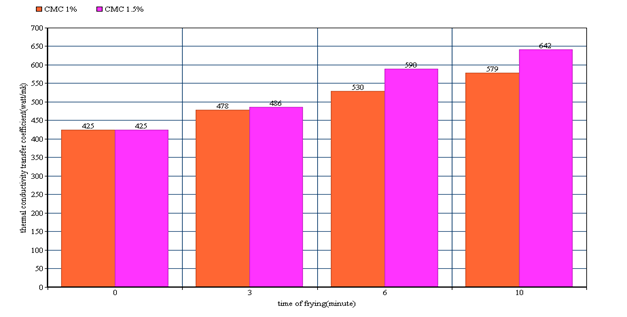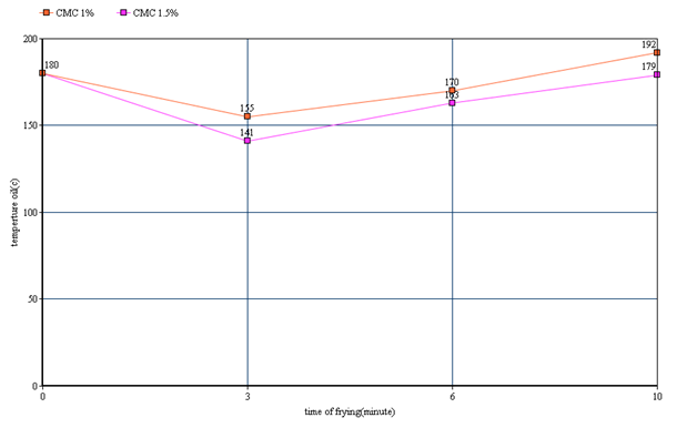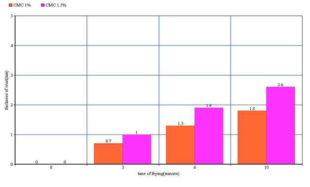 Cellulose derivatives were selected from experiments done with fried potato strips. Figure 1 showed that effect of frying time on potato weight losses. It was noticed that, potato weight loss percentage were 24 and 12% for 1 and 1.5% of CMC potato coated. Coating with CMC applied on potato strips reduced oil uptake and led to a higher retention of moisture content during deep fat frying. With increase of frying time, the potato weight loss was decreased. It was noticed that the increase of frying time (from 0 to 10 min), the values of potato weight were decreased (from 50 to 28 gm) and (from 50 to 31 gm) for 1 and 1.5 % CMC of potato strips [10]. Loss of potato weight were increased at CMC 1%, this was by increased oil absorption. We resulted that temperture of oil were 184 °C and 179 °C after 10 minute of frying for CMC 1%, CMC 1.5%. Oil temperture were higher at CMC 1% than CMC 1.5% after 10 minute of frying. Oil uptake increased at high oil temperture (Figure 2). We were seen thermal conductivity coefficient (K) not significant between CMC % 1 and 1.5% CMC. Thermal conductivity coefficient (K) were 579 and 642 watt/mk for CMC 1% and CMC 1.5% respectively amount of K were higher at CMC 1.5% but at CMC was enough (Figure 3). Thicknesses of crust were studied also for 1% and 1.5% CMC and results showed that thickness were 1.5 mm and 1 mm for 1.5% and 1% CMC respectively (Figure 4). Final result, percent of oil uptake after 10 minute of frying were 20.9% and 25.6% for CMC 1.5% and CMC 1% respectively, thus CMC 1.5% were the best of cover of frying for production of low fat french fries potato (Figure 5).