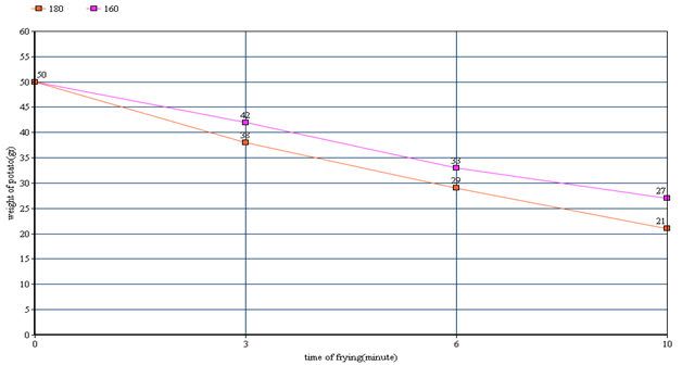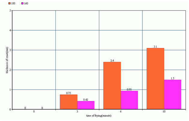 Our results revealed that temperture of frying at 180°C had more oil uptake than temperture temperature of 160°C. As it can be seen in Figure 1, potato weight (gm) were increased with increase of frying times, at time of frying (10 minute) potato weight of potato were reached minimum. For two size of potato, weight loss % were 64% and 58% for frying temperture of 180°C and 160°C respectively with significant deference (p<0.05).9 Similar results were obtained at frying temperture 160°C and 170°C. On the other hand, loss of water is expected for two temperture but result of other researchers was for other variety of potato and less time of frying. This result was significant (p<0.05). In Figure 2, temperture of oil at first decreased untill 3 minute of frying and increased from 3 to 10 minute for two tempertures 180 and 160°C, but were more at 180°C. This difference were non significant (p>0.05). Our result showed that temperture of oil was higher 180°C than 160°C of frying. Thus oil uptake was higher at temperture of 180°C (p<0.05). Considering crust evaluation, temperture of 180°C were related the highest thickness at 10 minute of thickness were 1.5 and 3.1 mm for 160°C and 180°C respectively this diferent were significant (Figure 3). Although thickness of crust was higher at 180°C but at 160°C was enough. Thermal conductivity coeffient were 750 and 500 wat/mc for 180°C and 160°C respectively, which were significant (Figure 4). At last, we resulted the best temperture of frying were 160°C for 10 minute for production of law fat french fries potato. Oil uptake % were 28% and 23% for 180°C and 160°C respectively (p<0.05) (Figure 5).