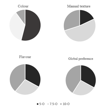 The effects of okara addition on the sensory characteristics of breads are presented in Figure 3. The sensory analysis was carried out with the 3 formulations of bread enriched with okara, in order to determine sensory attributes such as: color, manual texture, taste and overall preference. It was concluded from the multiple comparisons test that the color of the 5-O and the manual texture of 7.5-O were statistically preferred. While flavor and overall preference attributes did not present significant difference in sample ordering. It is important to highlight that all the formulations were accepted by the panelists, and the bean flavor was not perceived by them.