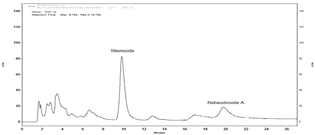 In leaf chemical traits, our results in dry leaf steviol glycosides concentration, yield, and reb A/stev ratio (Stev 7.52 - 8.19%, Reb A 5.96 - 8.04%, major steviol glycosides 13.48 - 16.20%, Stev 5.38 - 6.80 g/plant, Reb A 4.36 - 6.57 g/plant, major steviol glycosides 9.74 - 13.37 g/plant, and reb A/stev ratio 0.79 - 0.98) are comparable to or higher than those reported in the literature for different cultivars. Lower or comparable dry leaf concentration and yield of Stev, Reb A and major steviol glycosides (SGs), and Reb A/Stev ratio have been reported for different cultivars by various authors. For instance, Stev 7.4%, Reb A 6.0%, SGs yield 11 - 14 g/plant,3 Stev 4.3 - 4.9%, Reb A 2.7 - 3.5%, and Reb A/Stev ratio 0.58 - 0.85 (Tavarini et al, 2015b), SGs yield 0.7 - 8.4 g/plant,29 major steviol glycosides 10.4 - 12.6%, SGs yield 6 - 7 g/plant, Reb A/Stev ratio 0.61.28
