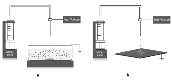 Electrospraying also known as an electrohydrodynamic atomization is a technique for atomizing liquids. The origin of electrospraying is on the base of the charged droplets theory which the interface of the droplets could be deformed by the applied electric field on a liquid droplet which egressing a capillary.1 Electrospray is a well-known phenomenon which has different applications such as fabrication of inorganic nanoparticles, thin films deposition, nanoparticles deposition, aerosolization, fabrication of micro/nano-capsules, etc.2 Electrospray could be applied in different status. Two simple systems are illustrated in Figure 1.