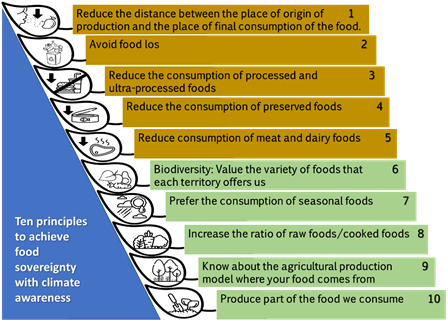 So, there really is a need to change a food culture of high dependence on the market, processed foods, and little variability, among other defects. In response, ten principles for “Climate-Conscious Eating” are presented to serve as a starting point and also as recommendations for the necessary transformation of the food system. These principles derive from our personal experience in the field of agroecology and environmental education, in addition to a review of the literature that considered the scientific knowledge achieved to validate what was stated. With the contextualization of these ideas, food sovereignty can be directed and contribute to mitigation and adaptation to the climate emergency.