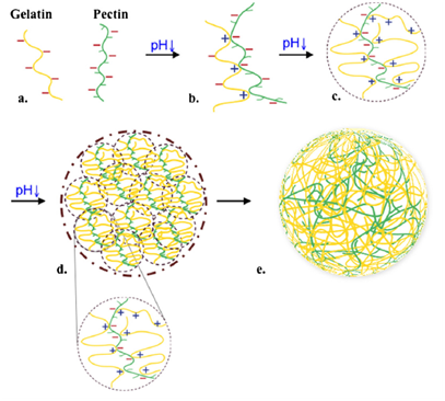 Pectin based Hydrogels: Pectin is an anionic polysaccharide hydrogel, poly (1,4-galacturonic acid), found in the cell walls of terrestrial plants, which has been traditionally used in food industry.30 Recently, it has also become a material of interest from the biomedical point of view. Tripathi et al.31 fabricated chitosan/poly (vinyl alcohol)/pectin ternary films and showed that the films have excellent antimicrobial properties for food packaging applications. Hydrogel microspheres may be useful for a variety of applications within the personal care, food, and pharmaceutical industries.32,33 In addition, they may also be used to protect, encapsulate, and release bioactive agents, such as pharmaceuticals, cosmetics, or nutraceuticals. Wu et al.34 demonstrated the potential of using hydrogel microspheres formed from gelatin and pectin to replace fat and starch granules. These hydrogel particles can be formed via electrostatic complexation (Figure 4).34,35 Solution conditions are manipulated so that the gelatin and pectin molecules associate with each other through electrostatic attraction, which leads to phase separation into a polymer-rich phase and a polymer-depleted phase. These hydrogel particles may be promising candidates for the development of healthy reduced-calorie foods because they are assembled from proteins and dietary fibers.