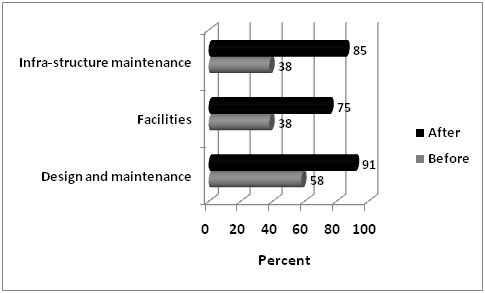 The design risks identified during gap audit posed a major challenge towards achieving FSMS. The overall risk associated with running live food operations were evaluated and 3 out of the 10 kitchens were considered to be in the high risk zone. As a result of this study, the operations at these three outlets had to be closed immediately. As part of the gaps identified in Critical Control Point (CCP) areas, a total of 32 points were specific to design, facility and infrastructure maintenance. These gaps covered specific aspects like flow of operations, the separation of rest rooms, sewage and drain system, absence of manholes, garbage handling including dump yard, floors, doors, ceiling, exhaust, vent, lighting, water facility and structures to support operations. The percent compliance as a result of awareness creation program in study area kitchens before and after is presented in Figure 1.