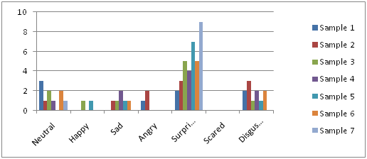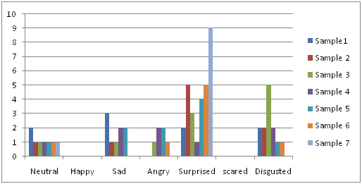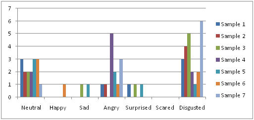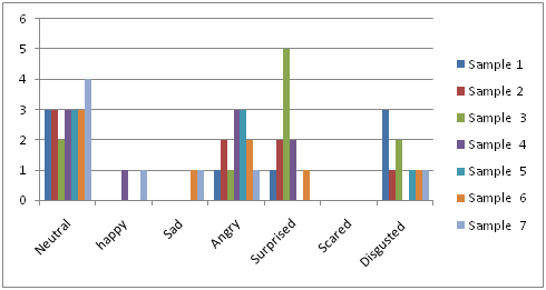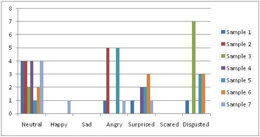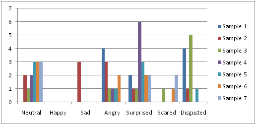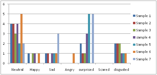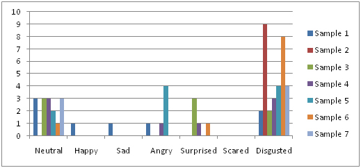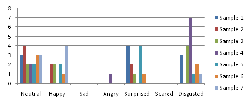 For the sensory evaluation process we used the Multivariate Analysis of Variance (MANOVA) the data represent the 7 face expressions that are expected during tasting the 7 samples and the number of participants who gave the same face expression during tasting each sample; Figures 1-20 shows the results of each face expression scale by each participant. We used the Analysis of Covariance (ANCOVA) to test the average of each face expression for all participants that presented in Figure 21.