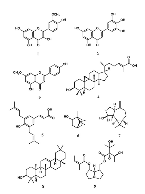 Meliponine propolis plays the same biological role as the propolis from Apis mellifera, i.e. it is used in the hive to seal holes and crevices, line the entrance of the hive and protects the community against microbial infections. Thus, it is expected that meliponine propolis has composition and biological activities similar with the propolis from European and Africanized honey bees. Not much has been studied about meliponine propolis. Nonetheless, the data available indicate that propolis from both stinging and stingless bees are similar regarding composition and biological properties. Reviews about chemistry and therapeutic effects of propolis from stingless bees have been published.9 All in all, it seems that the classes of compounds commonly found as constituents of Apis mellifera propolis characterize also meliponine propolis. Flavonoids have been found frequently in meliponine propolis. For example, the flavonols 3’-methyl quercetin (1) and kaemferol-7-methyl ether, the flavone tricetin (2), the flavanone sakuranetin (3) and the flavanonol aromadendrin 7-methyl ether were isolated from propolis of the nest of Trigona spinipes (“arapuá”), together with cycloartane triterpenes, such as mangiferolic acid (4). It was concluded that the plant source of resin is an exudate of the bark of Eucalyptus citriodora.10 Prenylated cinnamic acids characteristic of Brazilian green propolis, such as artepillin C (5), were also detected in propolis from Tetragonisca angustula (“jataí”).11 Volatile terpenes, which are components of essential oils, have been detected as resins carried by bees of three species of Frieseomilitta silvestrii.12 Examples of these substances are the monoterpene borneol (6) and the sesquiterpene spathulenol (7). Triternoids, such as β-amyrin (8) were also detected in the same resin.