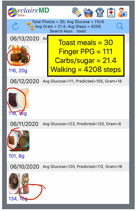 As shown in Figure 1, a photo of toast meals, he had a total of 30 meals with toast along with small quantity of vegetables which have a reasonable amount of carbs/sugar, or with high protein food, such as egg and seafood, with no carbs/sugar. These 30 toast meals have an average finger-pierced PPG of 110.6 mg/dL. His average carbs/sugar intake amount of 21.4 grams, and his post-meal walking of 4,208 steps.